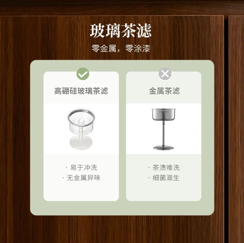市面上的煮茶器常用金属茶漏,不仅茶渍难以清洗,边边角角更容易滋生细菌。