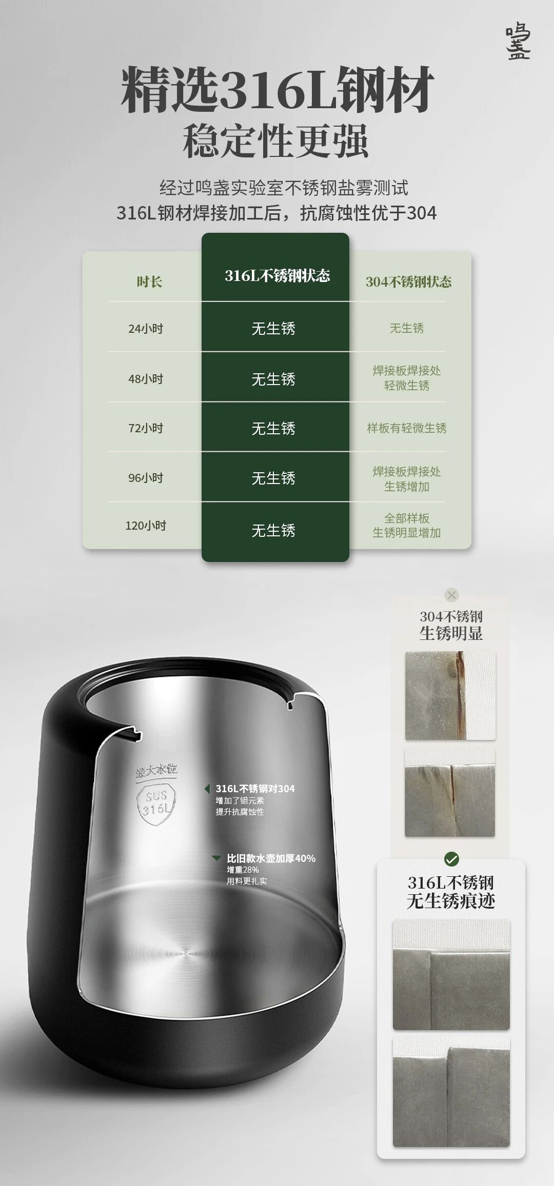 内胆材质选用316L不锈钢,经过不锈钢盐雾测试,316L钢材焊接加工后,耐腐性优于304,久烧不生锈,煮水更干净。