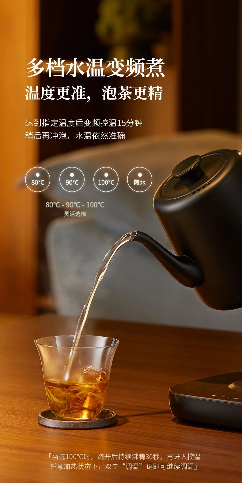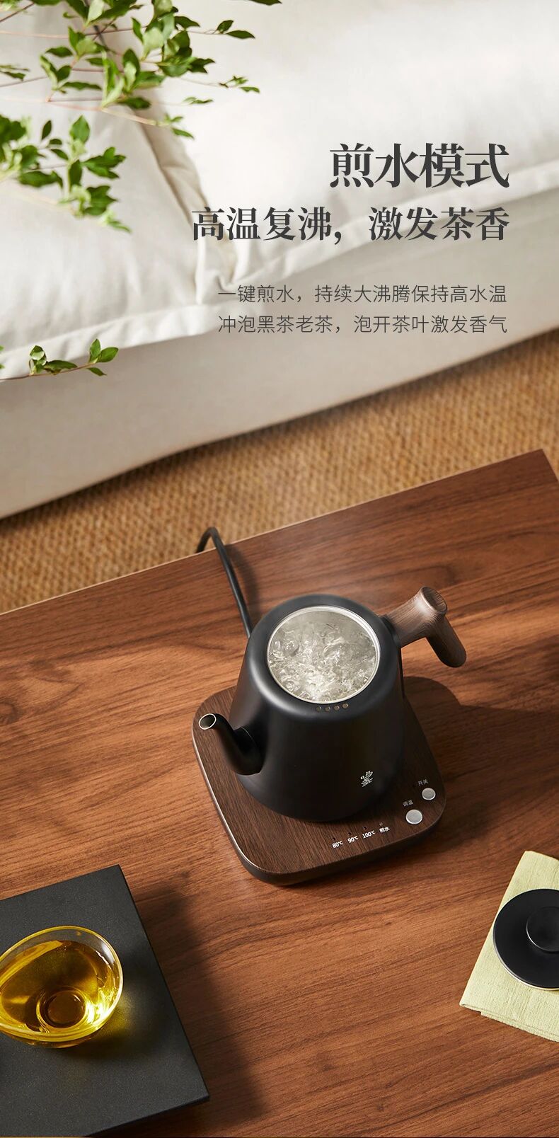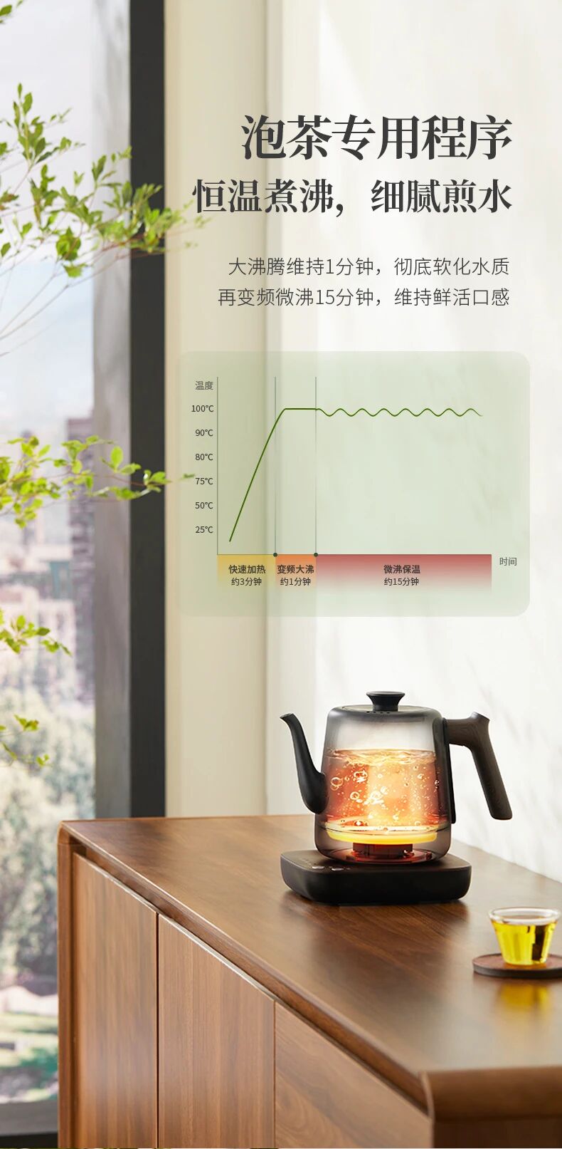 无缝烧水壶内设泡茶专用程序,先沸腾烧开1分钟,维持高水温彻底烧开,再以微功率将温度恒定在98度,整个过程持续15分钟,此时为微沸的“虾眼水”状态,水质细腻软滑,冲泡茶汤更鲜活。