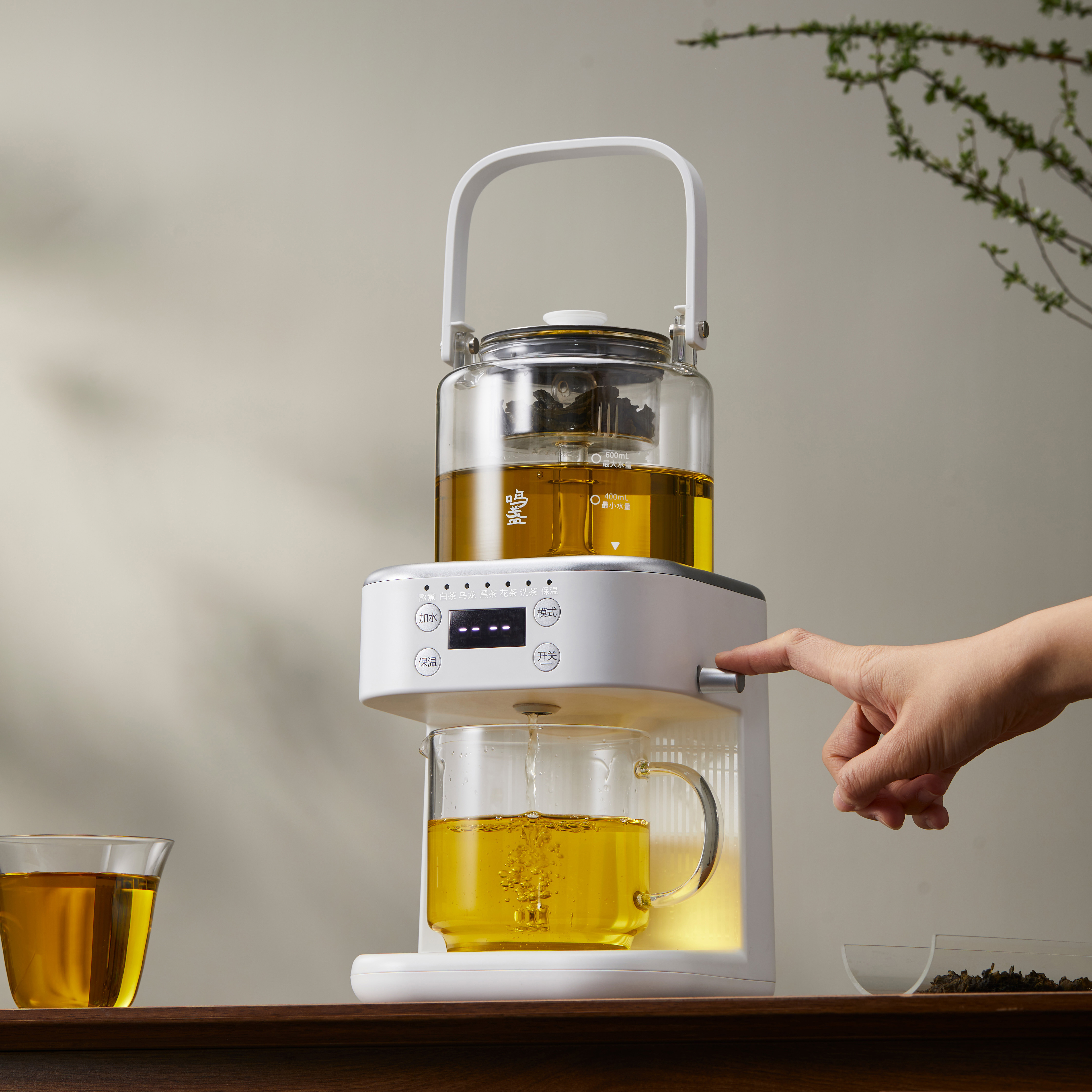 产品名称:鸣盏喷淋泡茶机 产品型号:MZ911A 产品颜色:白 尺寸:183L*186w*405Hmm 彩盒:407L*322*W*241Hmm / 邮购盒:425L*334W*265Hmm 产品重量:2.1kg 水壶容量:600mL 外箱装箱数:2台装 材质:高硼硅玻璃,316L不锈钢,PP 标准配件:泡茶壶,底座,茶漏,公道杯,水管